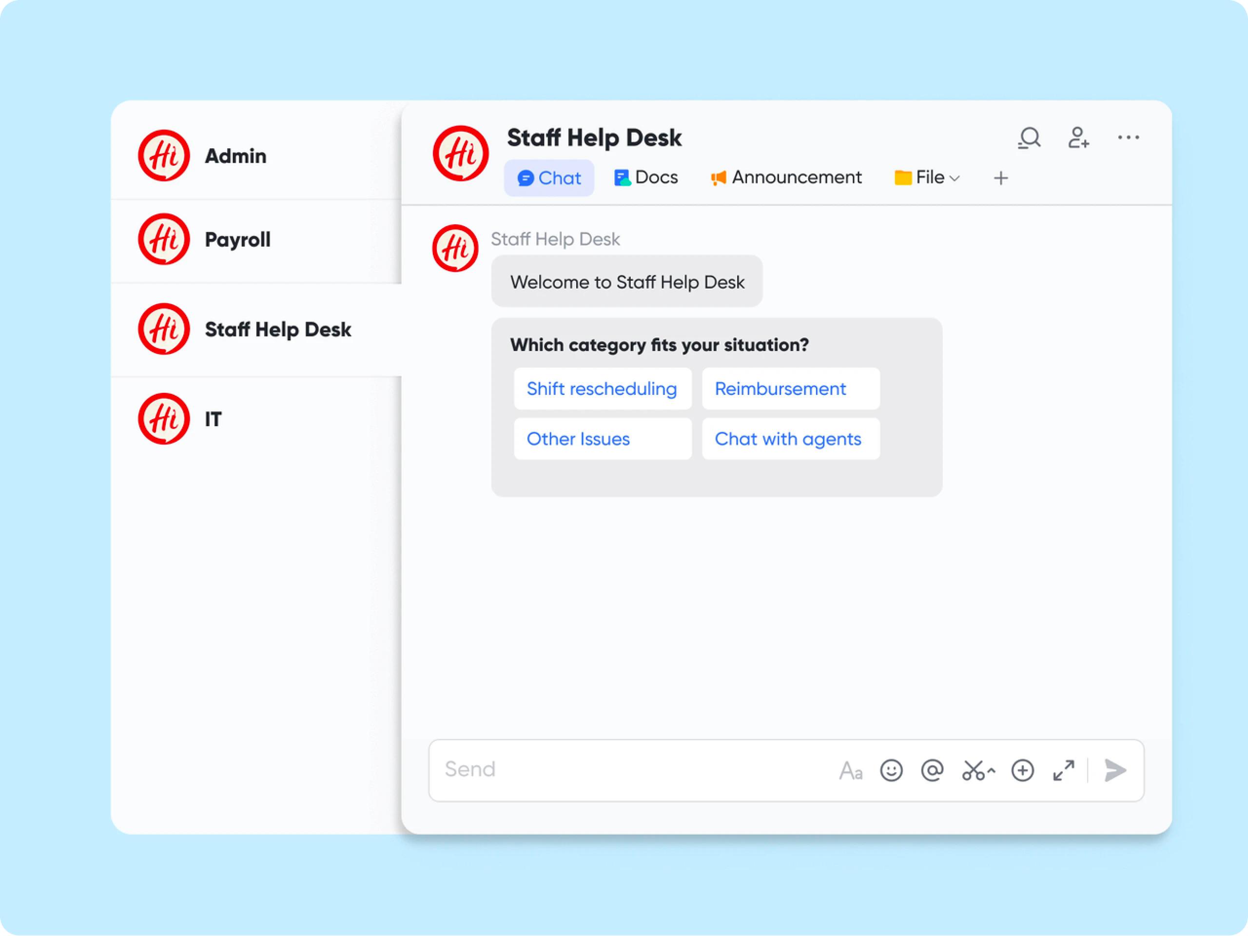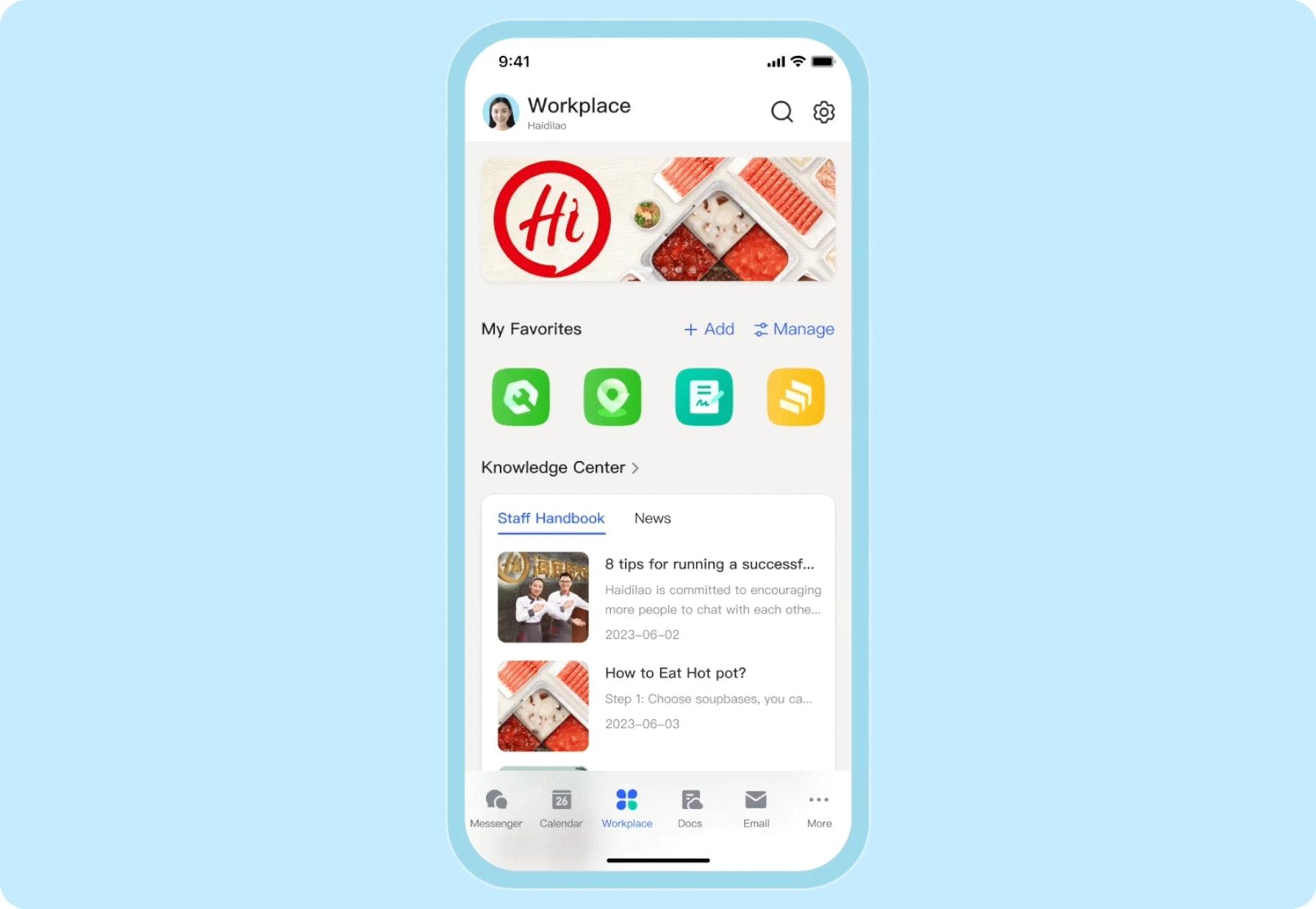 Để đảm bảo rằng mọi nhân viên đều nhìn thấy và ghi nhận các cập nhật quan trọng, Haidilao chia sẻ chúng thông qua Thông báo của Lark để đưa các cập nhật đó đến các nhân viên có liên quan một cách chính xác. Ngoài ra, công ty còn cải thiện khả năng đáp ứng dịch vụ của nhân viên bằng cách tự động hóa hơn 70% hoạt động hỏi đáp thông qua Bộ phận trợ giúp của Lark, giúp nhóm quản trị viên tiết kiệm hơn 60.000 giờ mỗi năm.