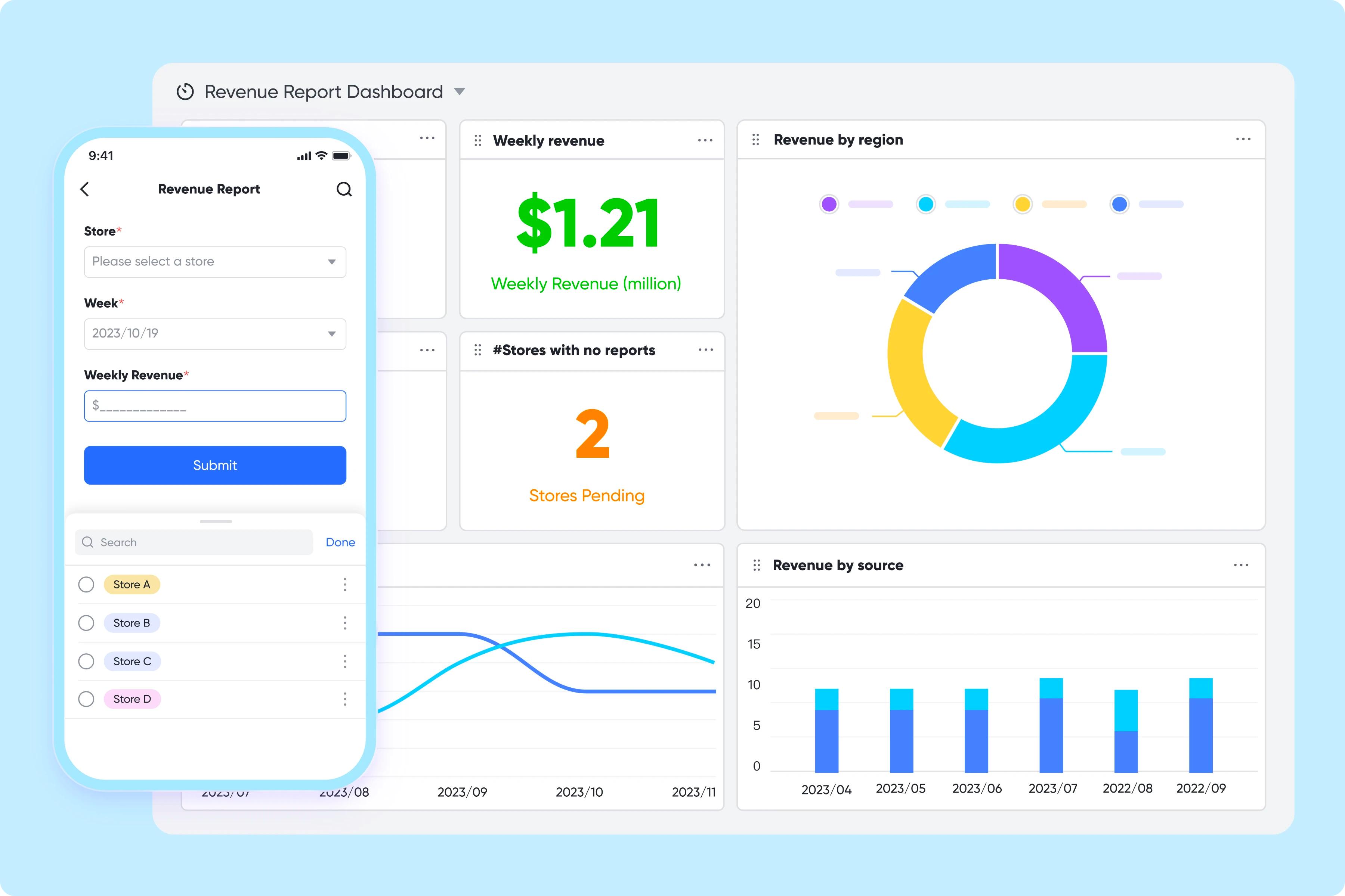 Các quản lý cửa hàng có thể dễ dàng gửi báo cáo doanh thu. Bảng điều khiển sẽ được làm mới tự động dựa trên các con số. Ngoài ra, bộ phận kế toán tài chính cung cấp các quyền truy cập khác nhau trong Lark Base cho quản lý cửa hàng và dự báo doanh số bán hàng cụ thể mà không cần phải tạo ra nhiều biểu đồ.