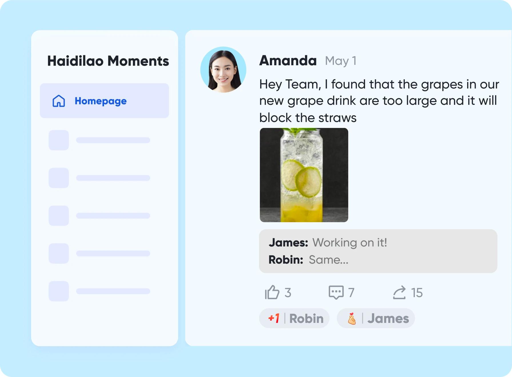 Các cửa hàng là nơi diễn ra hoạt động kinh doanh hàng ngày của Haidilao, và các đội ngũ nhận thức rằng chỉ bằng cách lắng nghe và xử lý các thông tin từ hiện trưởng thì công ty mới có thể đưa ra các quyết định đúng đắn. Sử dụng Lark Moments, Haidilao tạo ra các bảng chủ đề nơi tất cả nhân viên, cho dù ở cửa hàng hay văn phòng, đều có thể nêu ý kiến, đề xuất hoặc phản hồi về trải nghiệm của họ.