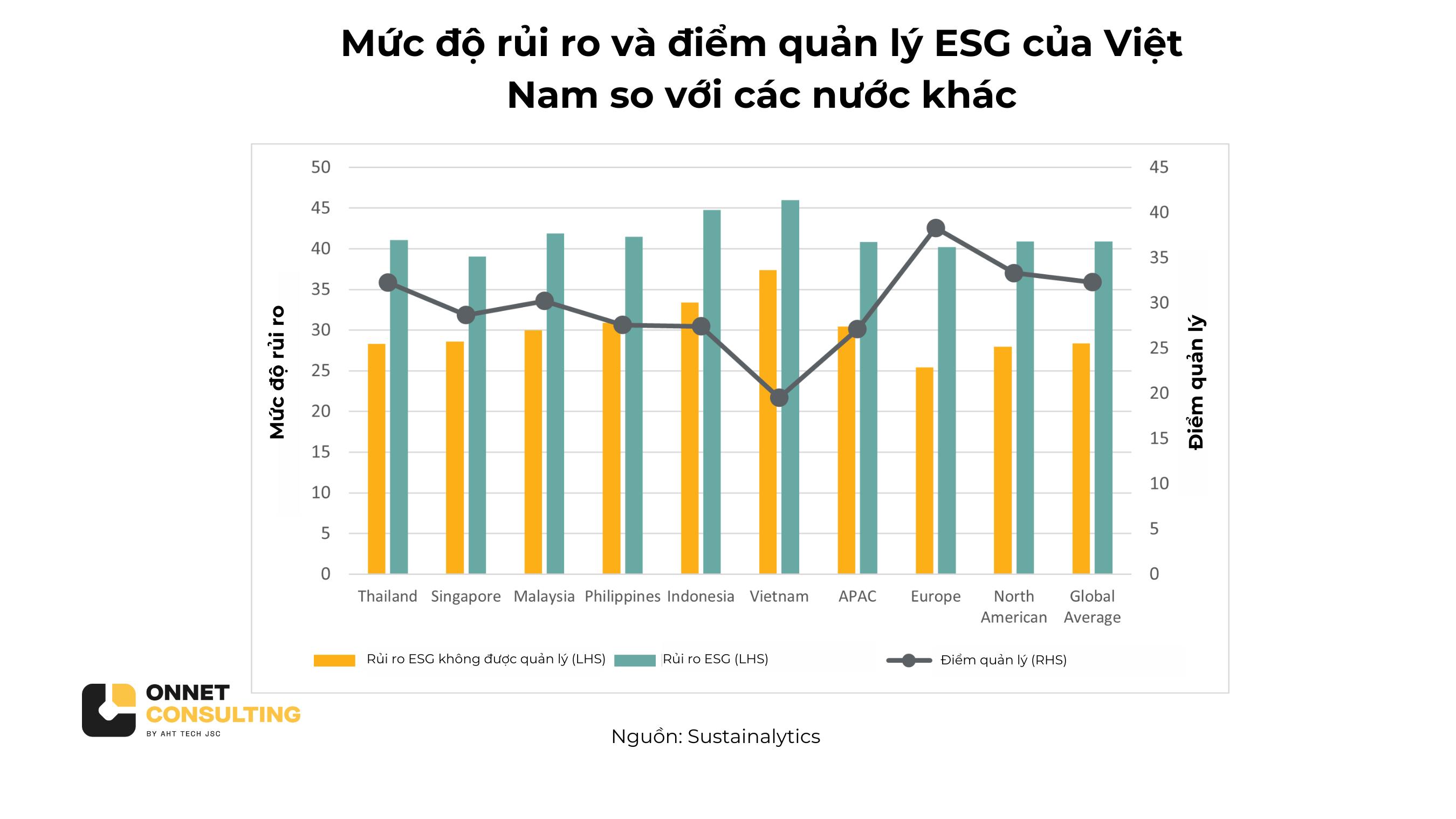 Theo phân tích của Sustainalytics về việc công bố và hiệu suất ESG, Việt Nam đang đối mặt với nhiều rủi ro ESG chưa được quản lý hiệu quả do điểm số quản lý thấp và sự phơi nhiễm cao trong các ngành như thép, khai thác mỏ, dầu khí, tiện ích điện và thực phẩm. Với sự nhạy cảm trước biến đổi khí hậu, Việt Nam đặt ưu tiên cao vào việc phân tích các công bố ESG để giải quyết các mối lo ngại một cách hiệu quả.