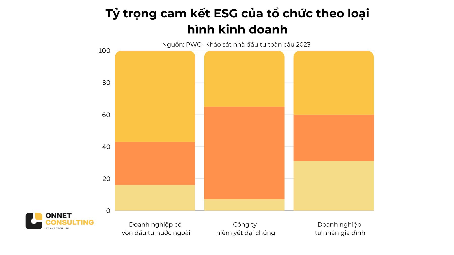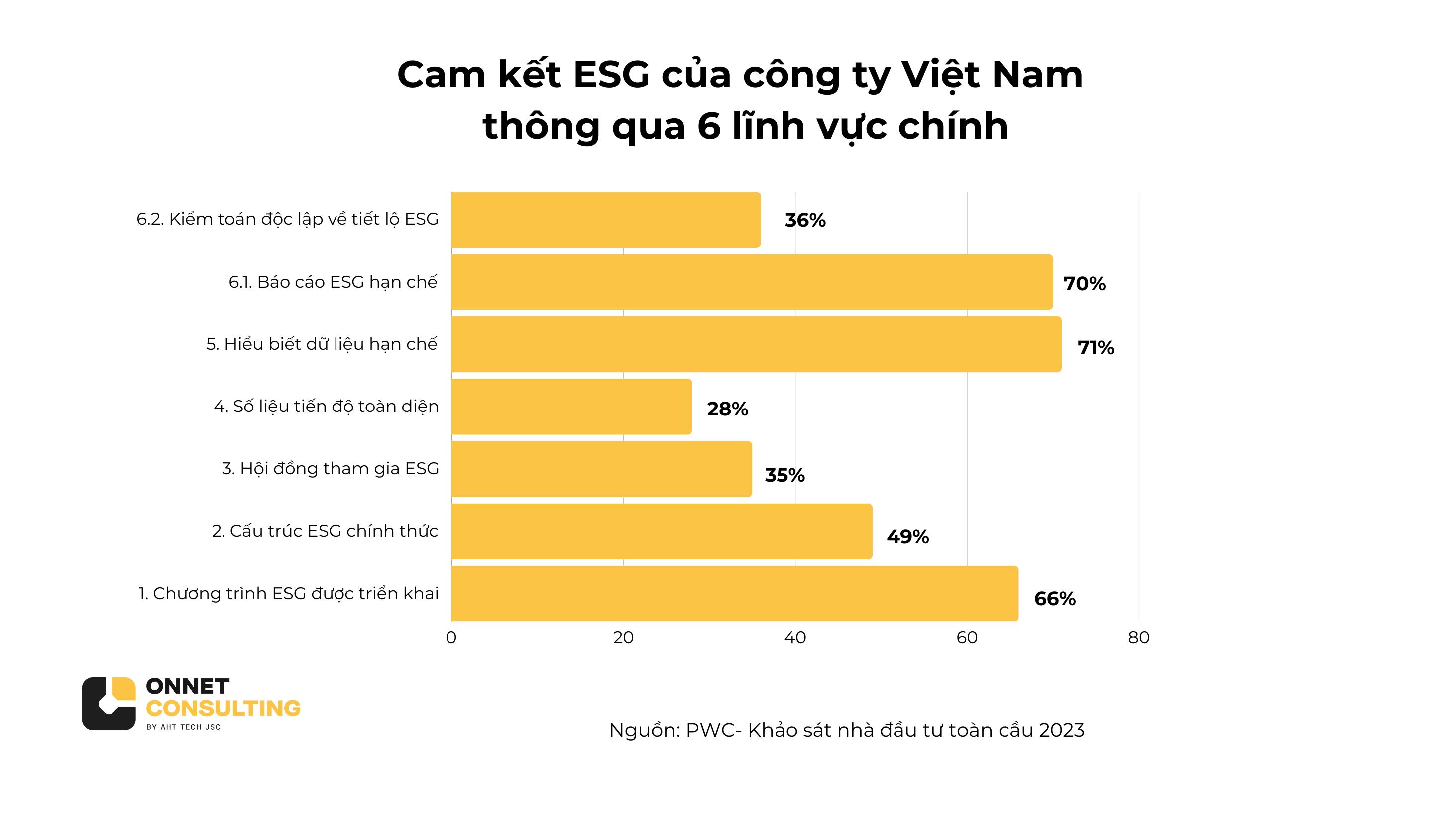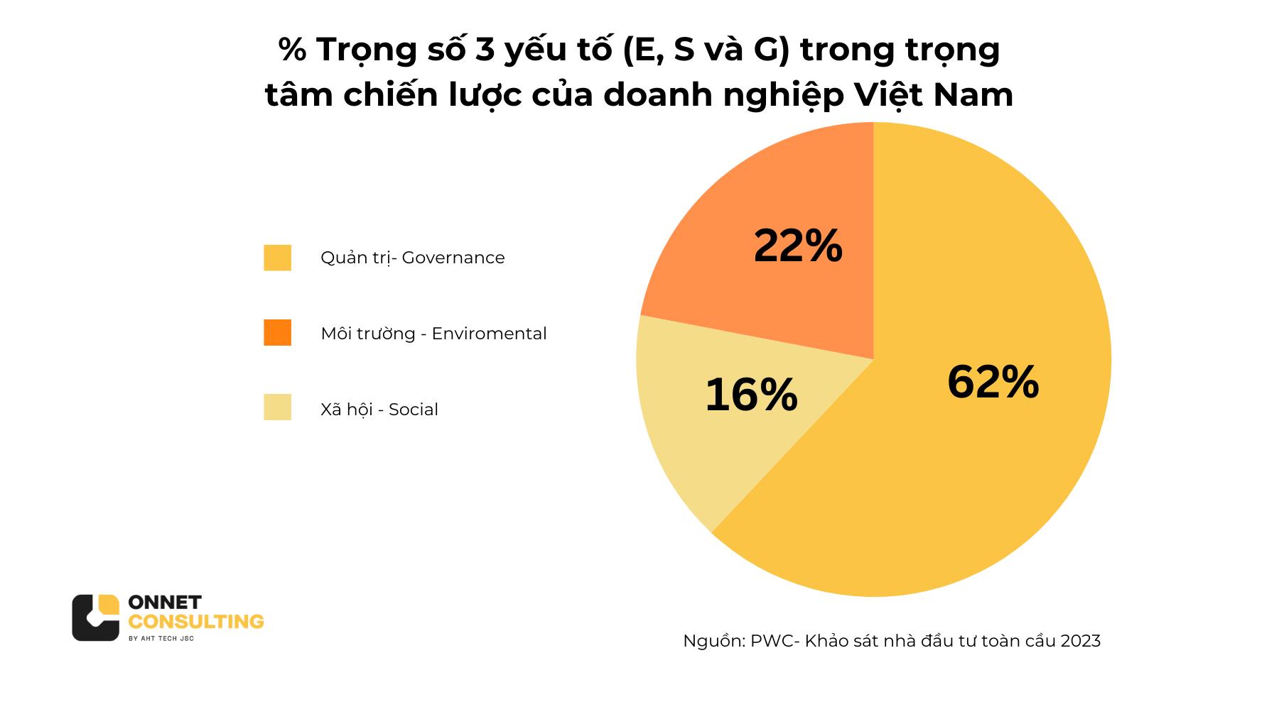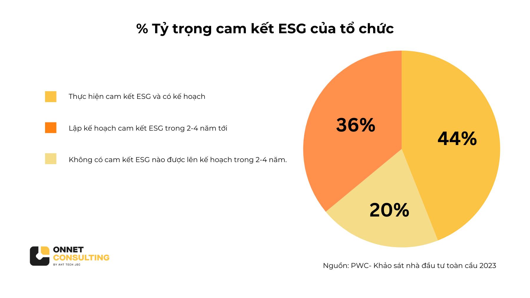 Trong một khảo sát do PwC và Viện Thành viên Hội đồng Quản trị Việt Nam (VIOD) thực hiện với 234 người tham gia (bao gồm 55 người từ các công ty niêm yết), kết quả cho thấy 80% doanh nghiệp Việt Nam đã cam kết hoặc dự định thực hiện các cam kết về ESG trong 2-4 năm tới.
