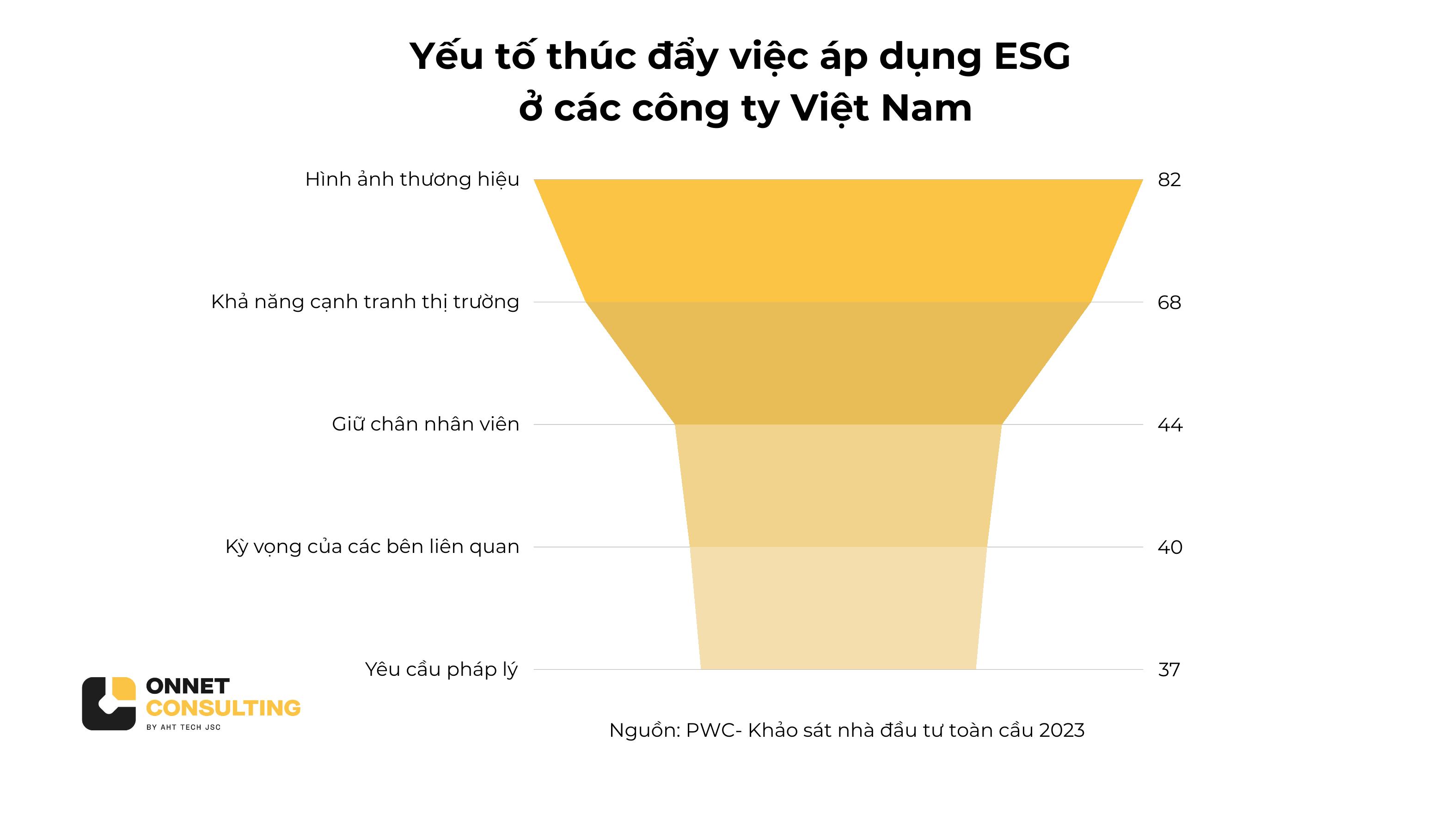 Các công ty đang ngày càng có động lực để giải quyết các vấn đề ESG do áp lực từ người tiêu dùng, nhân viên và nhà đầu tư. Tại Việt Nam, 82% người tham gia khảo sát cho rằng hình ảnh và danh tiếng thương hiệu là động lực chính thúc đẩy họ theo đuổi các sáng kiến ESG, tiếp theo là mong muốn duy trì tính cạnh tranh (68%). Các yếu tố khác bao gồm việc giữ chân nhân viên và đáp ứng áp lực từ nhà đầu tư và cơ quan chính phủ.