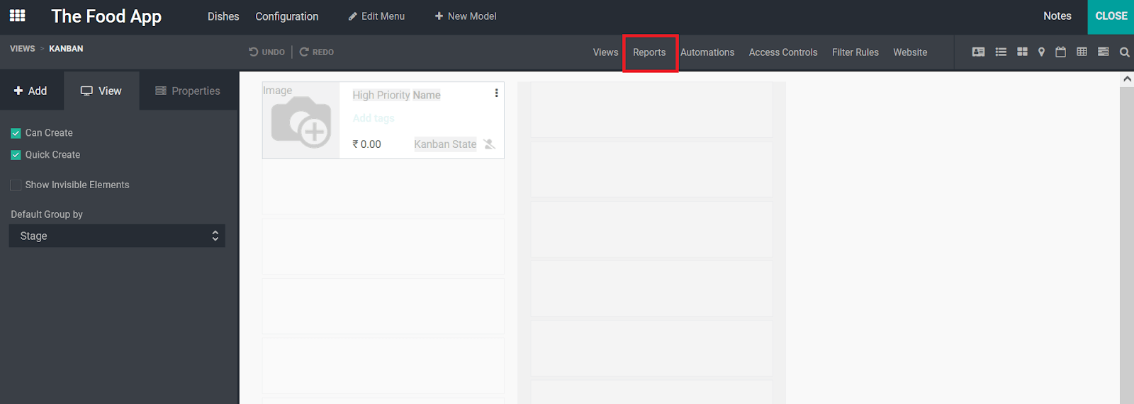 Trong trường hợp, bạn đang tạo một mô-đun mới bằng cách sử dụng mô-đun Studio. Bạn sẽ phải cấu hình các chi tiết của báo cáo bằng cách chọn menu Báo cáo. Nó sẽ được mô tả cho bạn trong cửa sổ như hình ảnh bên dưới. Mặt khác, bạn phải tùy chỉnh một mô-đun hiện có. Hãy chọn biểu tượng "Studio" có sẵn trong bảng điều khiển của Odoo, biểu tượng này sẽ hướng bạn đến cùng một cửa sổ như được mô tả trong hình ảnh sau đây.