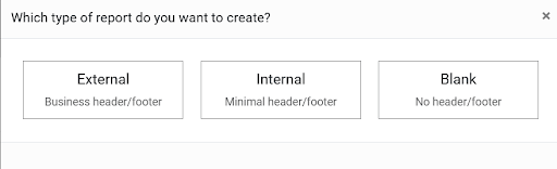 Khi chọn cửa sổ, bạn sẽ được mô tả với một cửa sổ mở lên yêu cầu bạn chọn loại báo cáo mà bạn cần được nhúng với các hoạt động tương ứng hoặc mô-đun. Ở đây, bạn phải chọn hình thức báo cáo từ ba tùy chọn mặc định có sẵn; Bên ngoài có đầu trang / chân trang Doanh nghiệp hoặc, Bên trong có đầu trang / chân trang Tối thiểu hoặc, Trống không có đầu trang / chân trang.