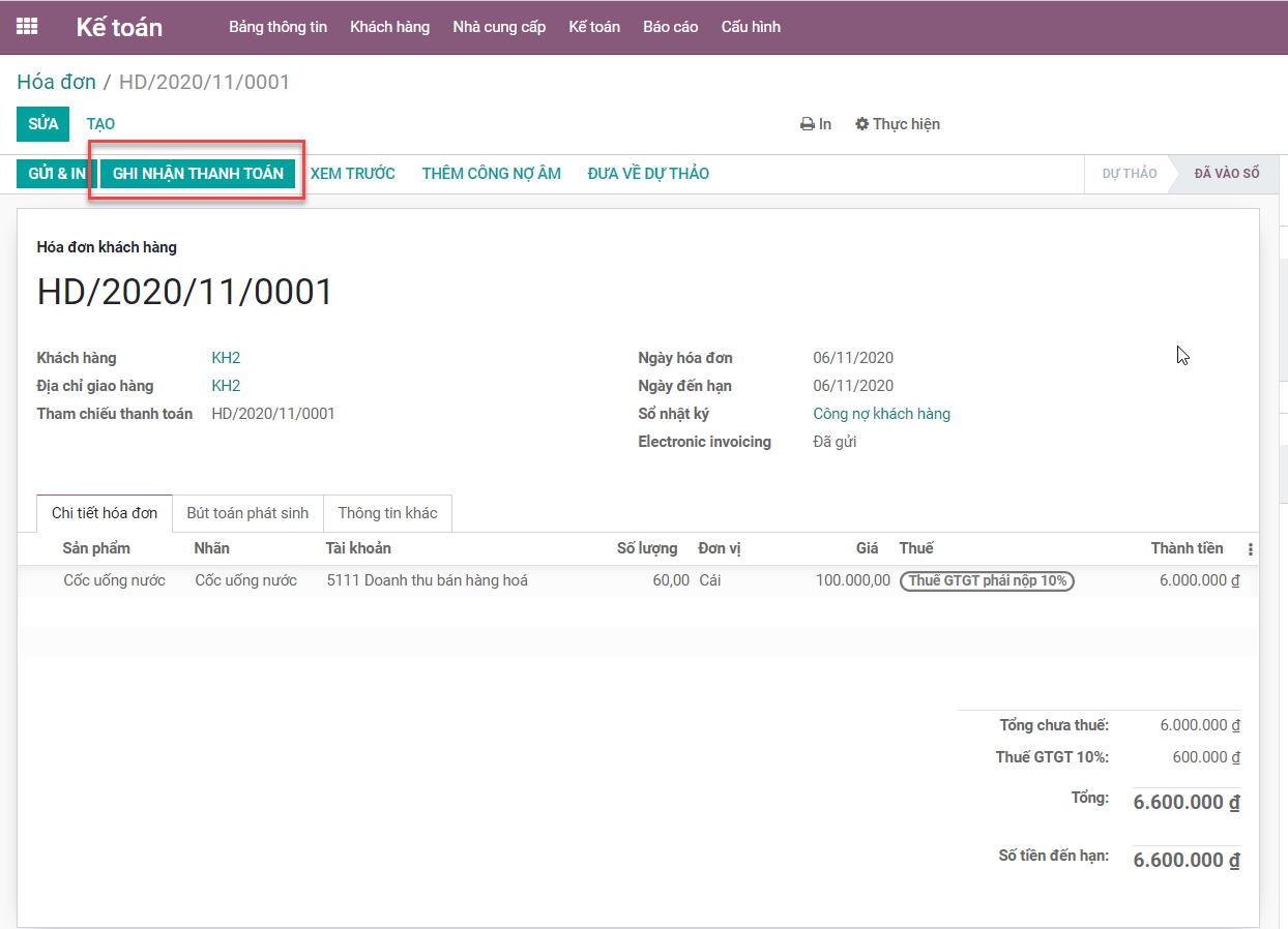 Vào Hóa đơn -> Chọn hóa đơn đã vào sổ -> Click Ghi nhận thanh toán