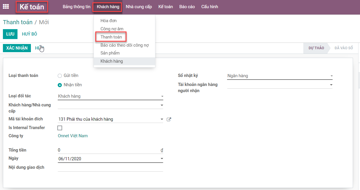 Khi chúng ta chuyển đến mô-đun Kế toán, chọn phần 'Thanh toán'. Các khoản thanh toán được thực hiện ở đây không được liên kết với hóa đơn. Nhưng thật dễ dàng để đối chiếu với bất kỳ hóa đơn nào sau này.
