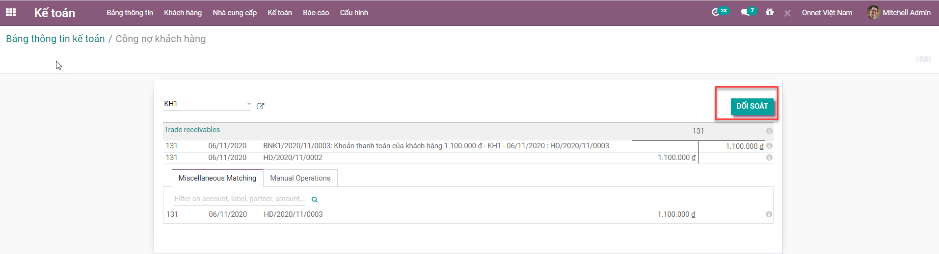 Tại đây, chúng ta sẽ nhấp vào từng dòng thanh toán mà chúng ta muốn điều chỉnh. Sau đó, nút "Đối soát" sẽ xuất hiện. Bằng cách nhấp vào nó, tất cả các khoản thanh toán đã chọn có thể được điều chỉnh.