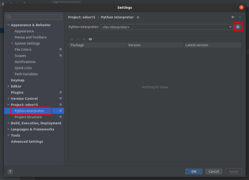 Đi tới Tệp -> Cài đặt -> Dự án: odoo15 -> Trình thông dịch Python