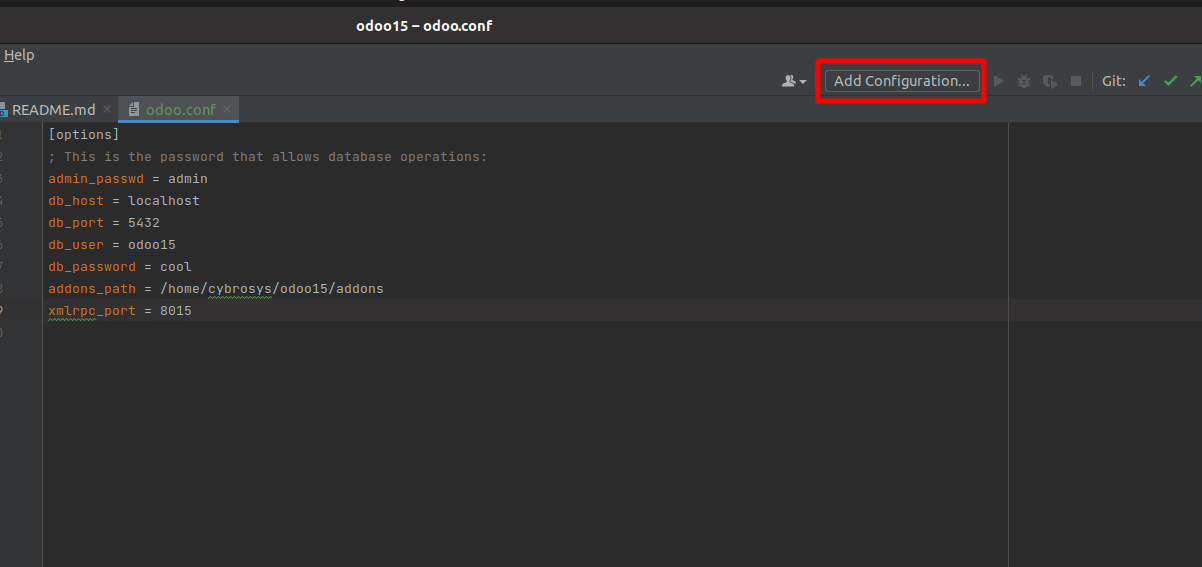 Bước 10: Tạo tệp odoo.conf bên trong thư mục odoo15