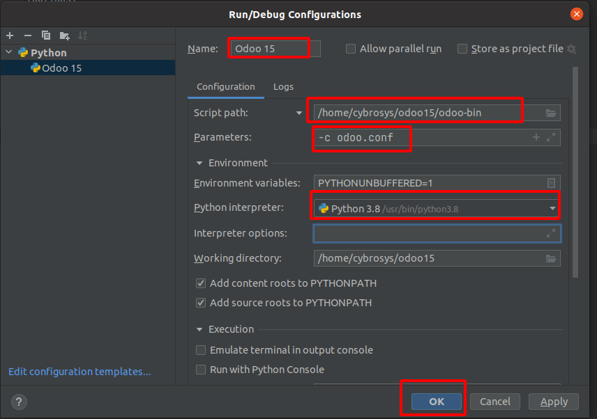 Đường dẫn Tập lệnh: Chọn tệp tin tệp ‘odoo-bin’ từ thư mục odoo15.