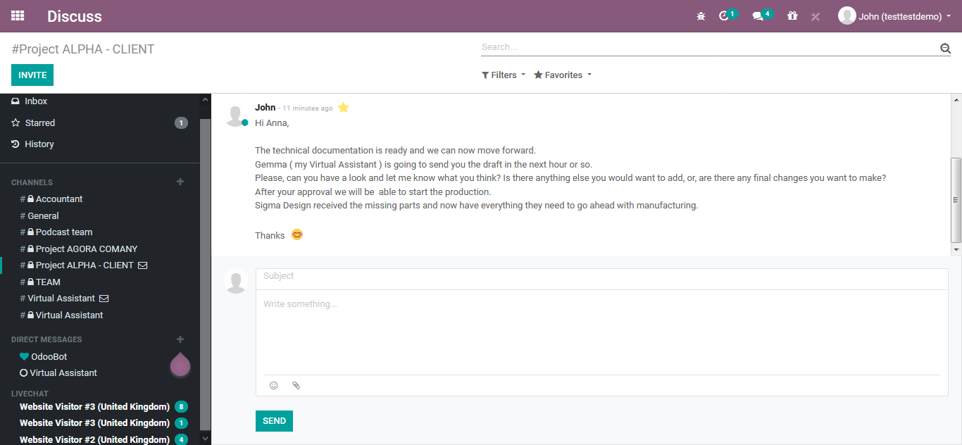 Từ nhắn tin trực tiếp, nhắn tin nhóm, trò chuyện trực tuyến, cuộc gọi thoại cá nhân và nhóm, tới thảo luận và chia sẻ tệp, Odoo Inbox giúp bạn giao tiếp minh bạch và hiệu quả trong tổ chức của mình. Nó cho phép giao tiếp liền mạch giữa các thành viên trong nhóm, các phòng ban và toàn bộ công ty. Ngoài ra còn có khả năng sắp xếp và lọc các cuộc trò chuyện thành các kênh khác nhau (cho các dự án cụ thể, hỗ trợ kỹ thuật, trò chuyện chung…). Người dùng có thể tổ chức nhiều dự án, nhóm và các mục khác bằng cách sử dụng thẻ gắn hashtag bắt đầu bằng ký tự #, cũng như chia sẻ tệp bằng cách kéo và thả chúng vào nền tảng.