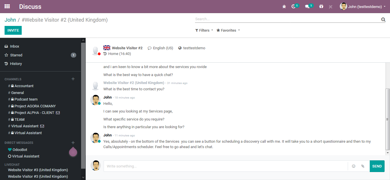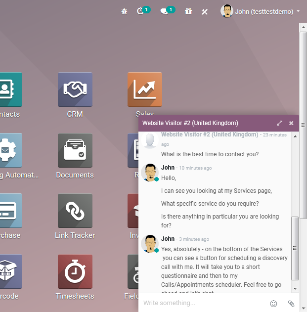 Trò chuyện trực tiếp Live chat tích hợp với trang web Odoo của bạn cho phép nhóm trả lời các câu hỏi, lên lịch cuộc hẹn và bán sản phẩm hoặc dịch vụ trong các cuộc trò chuyện 1:1 với khách hàng