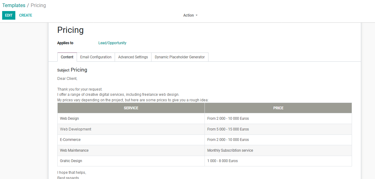 Đối với những phản hồi lặp lại nhưng yêu cầu nhiều tùy chỉnh, để tự động hóa thư trả lời, bạn có thể thực hiện một cách tiếp cận khác và tạo một mẫu e-mail mà bạn có thể chỉnh sửa và gửi. Hãy nghĩ về các e-mail giống như tính khả dụng hoặc giá trị của bạn cho khách hàng tiềm năng – nó sẽ phụ thuộc vào dự án, thời gian và tình huống, nhưng với một mẫu đã có sẵn, điều duy nhất bạn sẽ phải làm là thay đổi ngày và giá thực tế cho từng người.