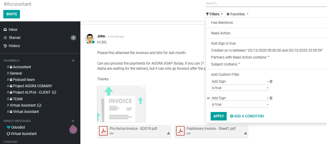 Trong hộp thư đến Odoo Inbox, tạo và sử dụng các kênh khác nhau như các bộ lọc hiện có hoặc tạo các kênh tùy chỉnh để thêm những quy tắc bổ sung vào e-mail của bạn. Bằng cách này, hộp thư đến Inbox của bạn sẽ chỉ hiển thị những e-mail cần thiết mà bạn phải xem, do đó khi cần kiểm tra e-mail, bạn sẽ chỉ tập trung vào những e-mail quan trọng nhất.