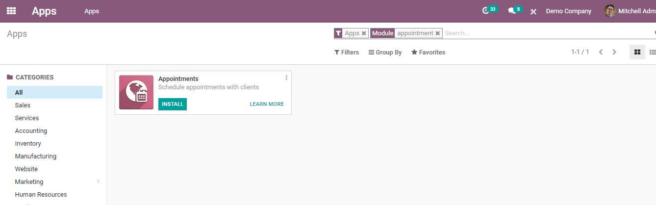 Để tạo điều kiện thuận lợi cho các chương trình lập lịch trước tiên, bạn phải cài đặt mô-đun cuộc hẹn. Người dùng có thể dễ dàng tìm và cài đặt mô-đun cuộc hẹn từ cửa hàng ứng dụng Odoo.