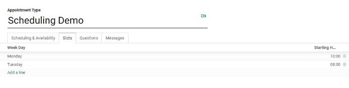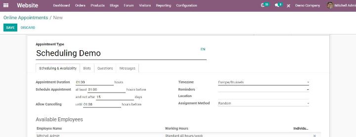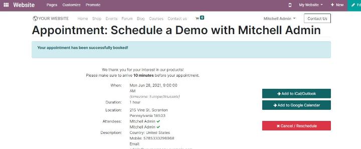 Odoo cung cấp cho bạn mô-đun lên lịch hẹn với Odoo tốt nhất để quản lý tất cả các cuộc hẹn của bạn bằng cách tự động hóa các quy trình lập lịch. Người dùng có thể sắp xếp các cuộc hẹn của họ một cách thuận tiện bằng cách sử dụng mô-đun này. Ngoài các hệ thống đặt chỗ truyền thống với số lượng lớn cuộc gọi và email để đặt chỗ, Odoo giảm bớt căng thẳng bằng cách giới thiệu hệ thống quản lý cuộc hẹn tự động.
