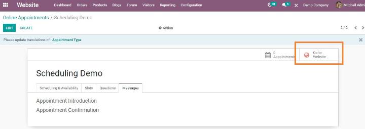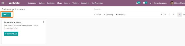 Mô-đun đã cài đặt sẽ tự động được tích hợp với mô-đun lịch của bạn. Truy cập menu cấu hình của ứng dụng trang web để lên lịch một cuộc hẹn mới. Khi nhấp vào nút 'Tạo' , bạn sẽ nhận được một biểu mẫu để điền về cuộc hẹn mới.