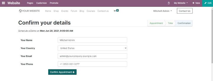 Họ có thể chọn một thời điểm thích hợp từ những ngày đã định. Bạn có thể xem các khe thời gian có sẵn bằng cách nhấp vào ngày có sẵn và chọn một theo yêu cầu của bạn. Bạn sẽ nhận được một trang xác nhận để điền vào một số chi tiết cơ bản như hình dưới đây.