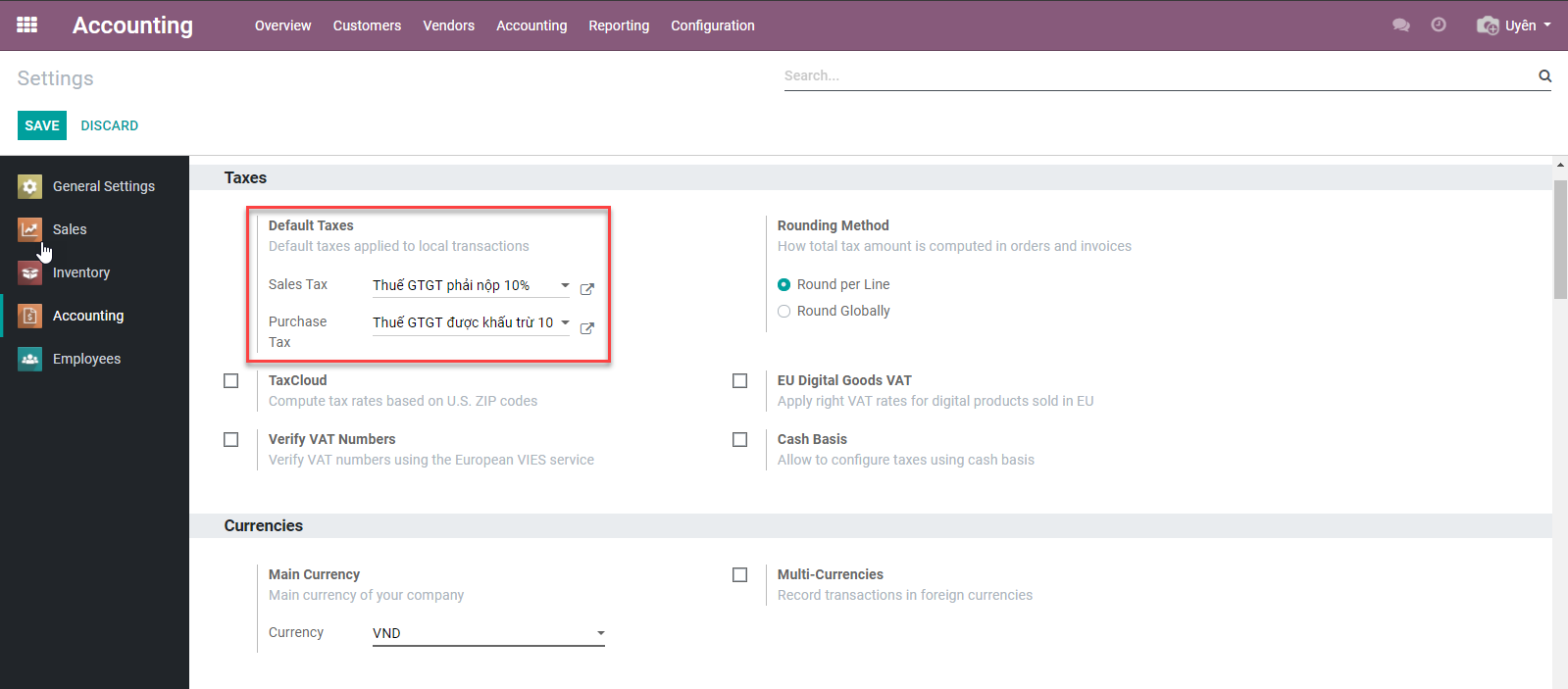 Để thay đổi thuế mặc định cho bất kì sản phẩm mới nào. Truy cập vào: Invoicing/Accounting ‣ Configuration ‣ Settings
