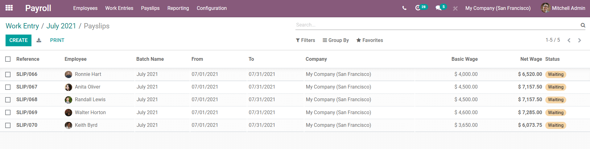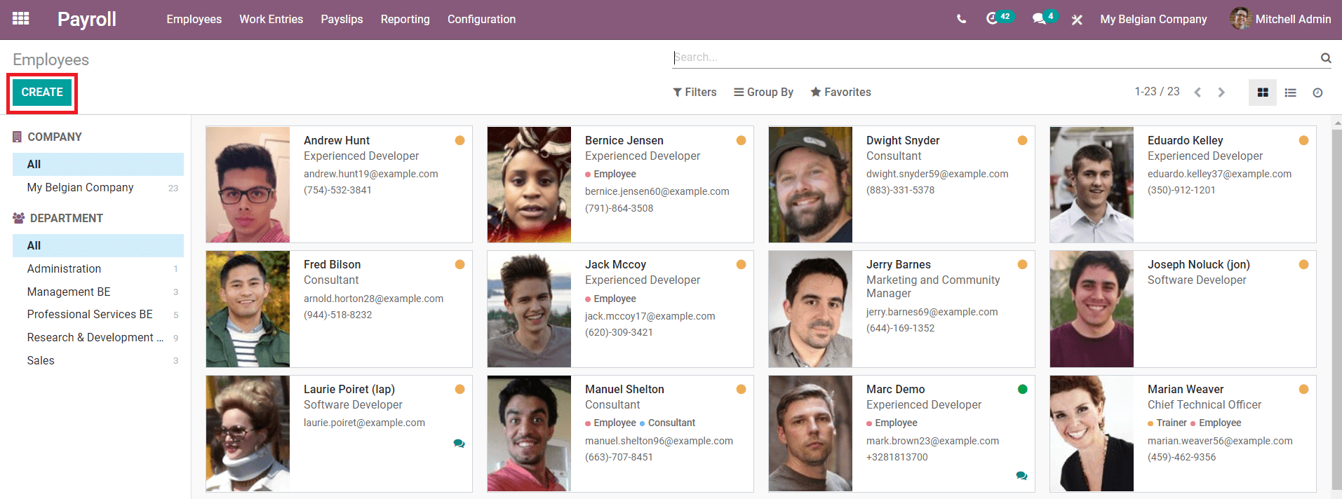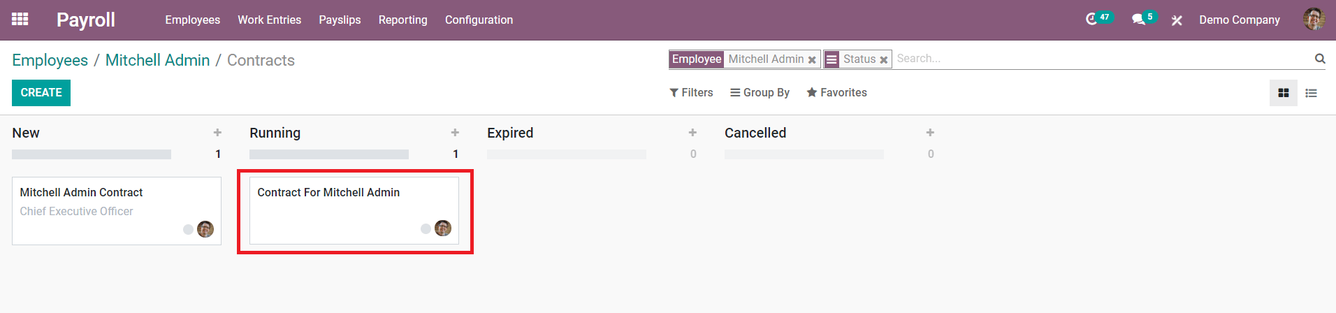 Khi chúng ta vào mô-đun, chúng ta sẽ nhận được danh sách tất cả các hồ sơ nhân viên trên trang tổng quan. Nếu bạn muốn thay đổi gói lương hoặc tạo hợp đồng mới, hãy chọn nhân viên tương ứng và cấu hình hợp đồng mới cho họ.