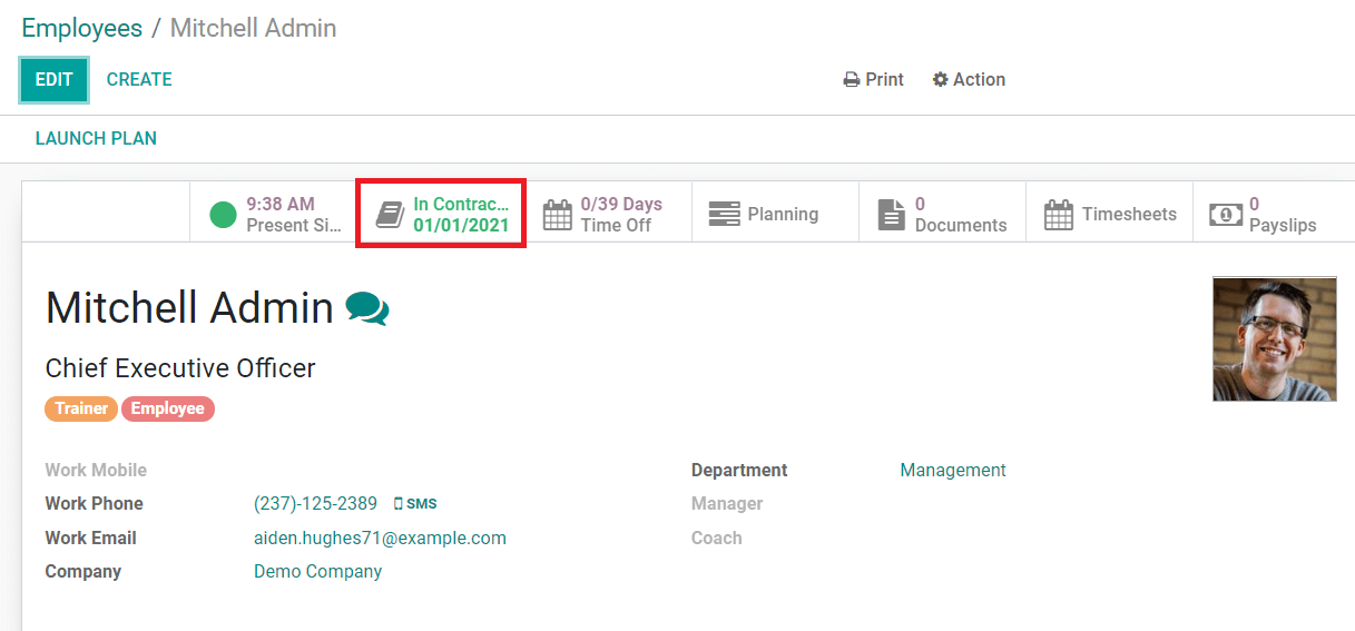 Sử dụng nút ‘Tạo’ ’, chúng tôi có thể thêm thông tin chi tiết về nhân viên mới và hợp đồng của họ. Tại đây, chọn một nhân viên và bạn có thể xem chi tiết hợp đồng đính kèm trong hồ sơ của họ.