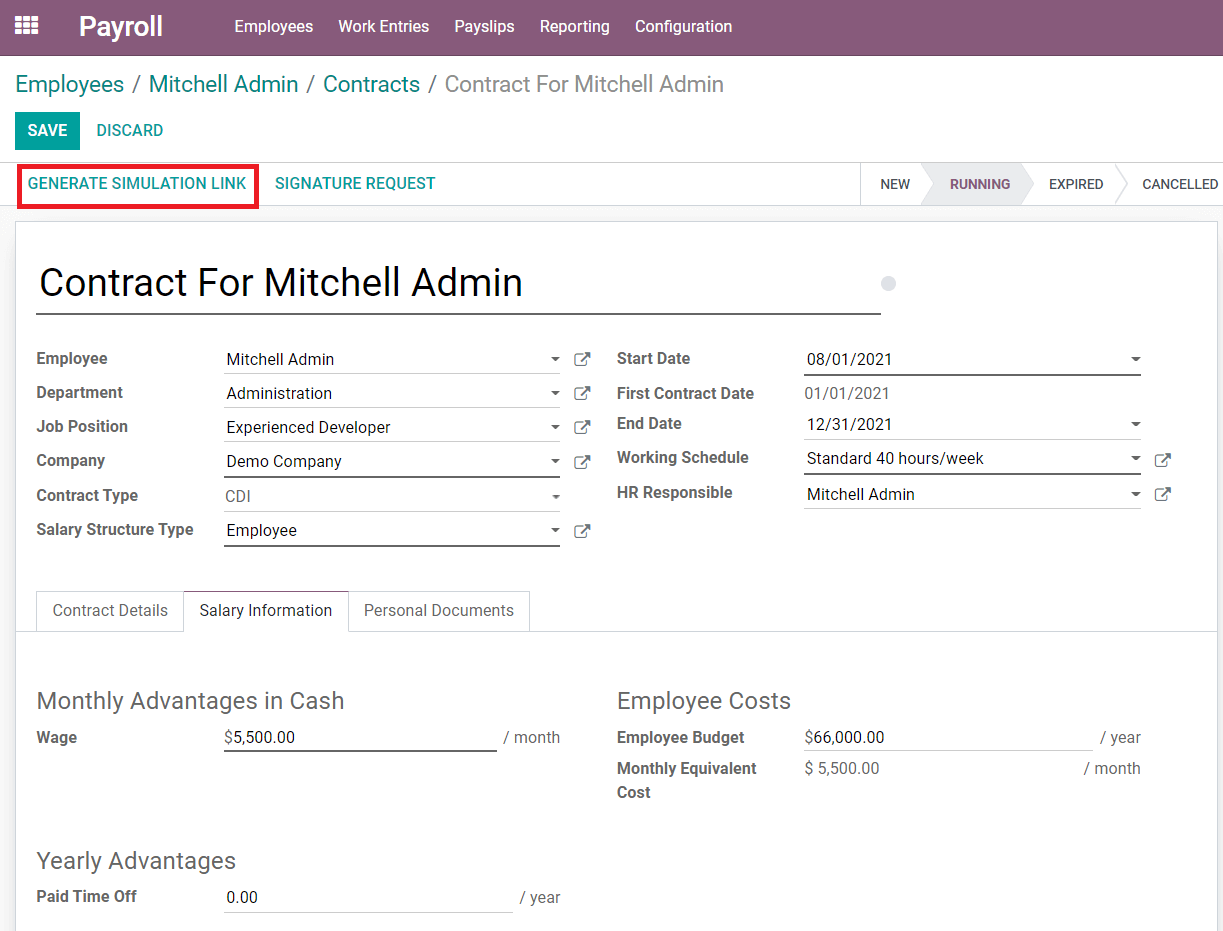 Cùng với thông tin chi tiết về vị trí công việc và công ty, hợp đồng còn bao gồm thời gian hợp đồng và lịch trình làm việc. Trong tab Thông tin lương, bạn có thể xác định mức thù lao của nhân viên. Hợp đồng mới được tạo có thể được gửi đến nhân viên qua thư bằng cách tạo một liên kết bằng cách sử dụng ‘Tạo liên kết mô phỏng’. Loại cấu trúc tiền lương của nhân viên được xác định bằng cách sử dụng liên kết bên ngoài 'Loại cấu trúc tiền lương', khi cửa sổ bật lên sẽ xuất hiện để thêm các chi tiết cần thiết về tiền lương.