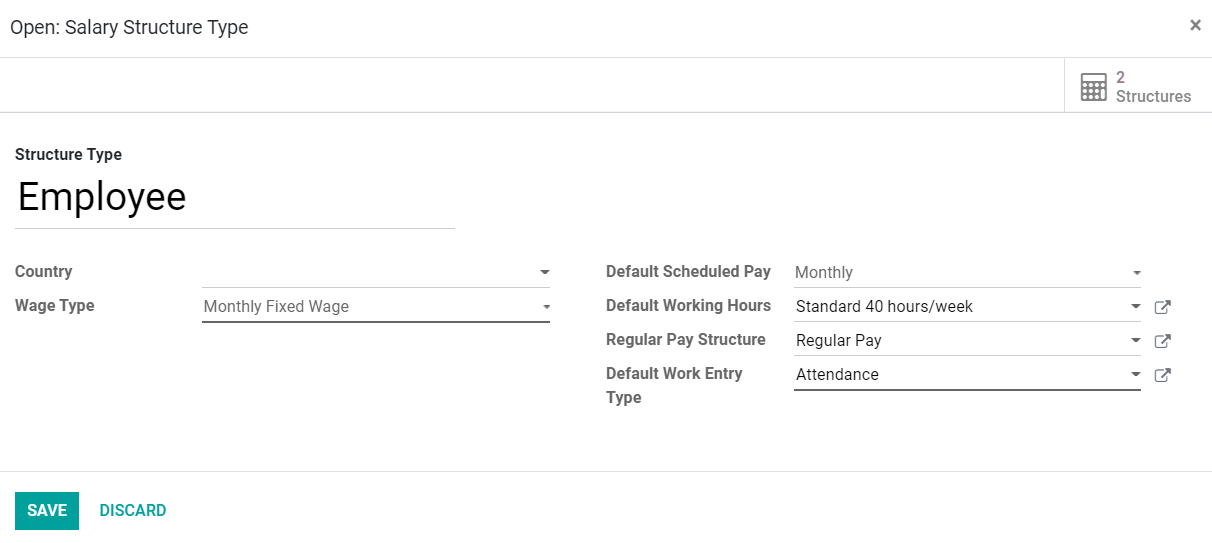 Bạn có thể chọn Quốc gia, Loại lương, Loại trả theo lịch trình, Giờ làm việc, Cơ cấu trả lương và Loại đầu vào làm việc. Bạn cũng được phép thiết lập các tùy chọn theo vị trí công việc của nhân viên.
