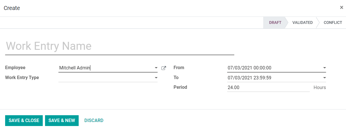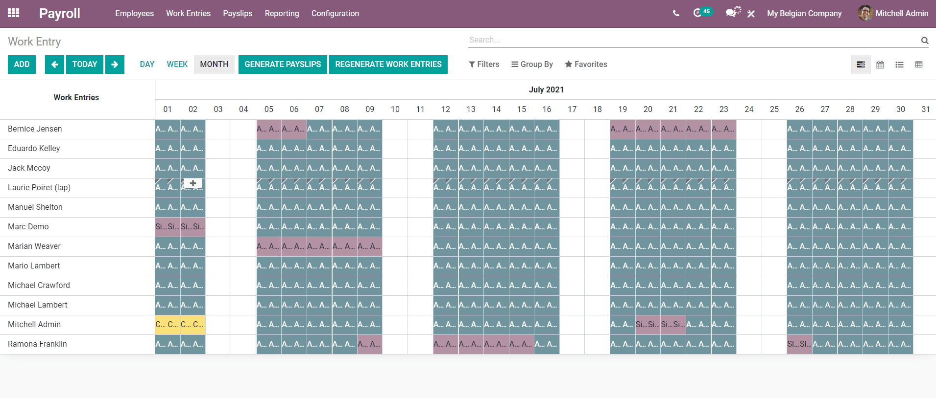 Thời gian làm việc và thời gian nghỉ của mỗi nhân viên được ghi lại cụ thể trong các phân hệ Odoo và dữ liệu này sẽ được tích hợp với phân hệ Tính lương để tính toán thanh toán. Phiếu lương được tạo ra từ các mục nhập công việc này và bạn phải giải quyết các lỗi xung đột xuất hiện.