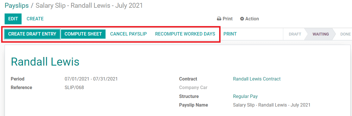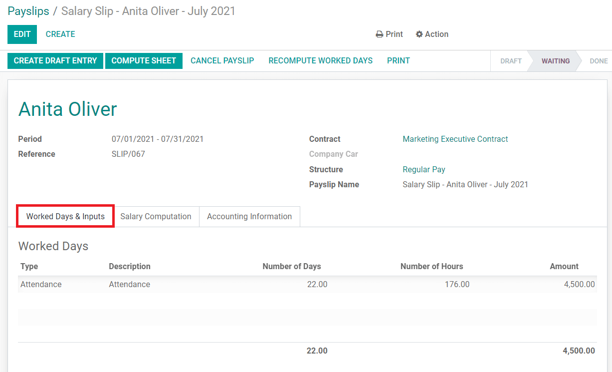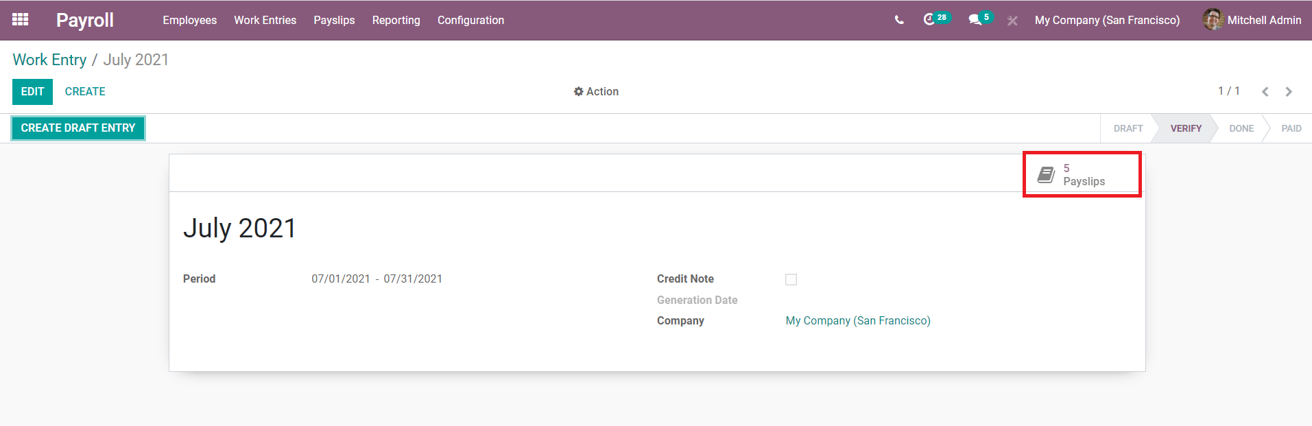 Điều này bao gồm tất cả các khoản phụ cấp, thuế, cơ cấu tiền lương và tất cả các khía cạnh được thêm vào lương hàng tháng của nhân viên. Nhấp vào 'Tạo một mục nhập nháp' để tiếp tục với phiếu lương.