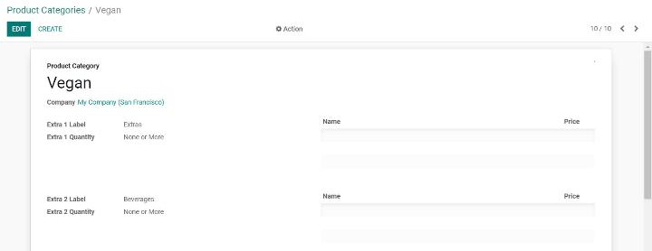 Trong cấu hình, Odoo cho phép có tùy chọn để thêm các danh mục sản phẩm. Ở đây chúng ta có thể thêm các danh mục khác nhau. Nó có thể dựa trên ẩm thực, danh mục chế độ ăn uống, v.v. Ví dụ: chúng ta có thể tạo các tùy chọn thuần chay, ăn chay, pescatarian, v.v.