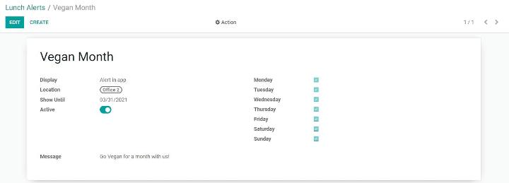 Khi cài đặt Module bữa trưa trên Odoo, nhà quản lý có thể định cấu hình nhà cung cấp, vị trí, sản phẩm và danh mục cũng như cảnh báo.