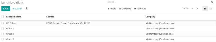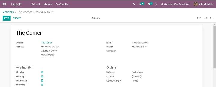 Doanh nghiệp có thể thêm các nhà cung cấp các món ăn trưa khác nhau cho công ty. Hầu hết các công ty có hợp đồng với nhiều nhà hàng khác nhau để cung cấp cho công ty. Odoo có thể tạo thông tin chi tiết về nhà cung cấp để sắp xếp việc giao hàng.