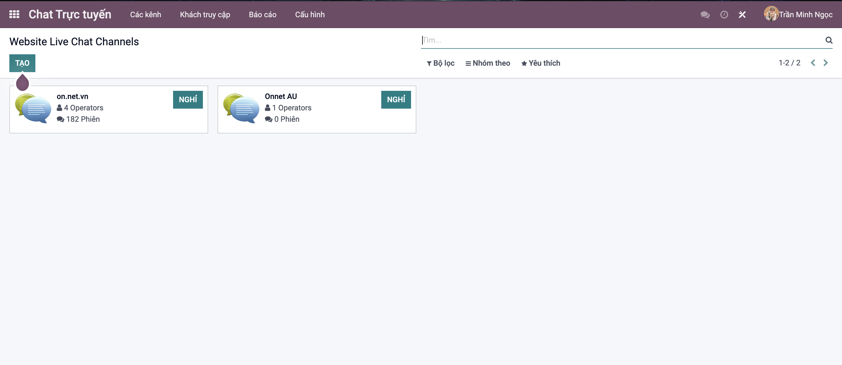 Mô-đun Live Chat của Odoo 15 giúp bạn phát triển một kênh trò chuyện trực tiếp cho trang web của mình. Bạn có thể quản lý tất cả các hoạt động liên quan thông qua tab Kênh trong trang tổng quan Live Chat của Odoo. Biểu tượng Tạo trong trang tổng quan Live Chat giúp bạn tạo một kênh mới, như trong ảnh chụp màn hình bên dưới.