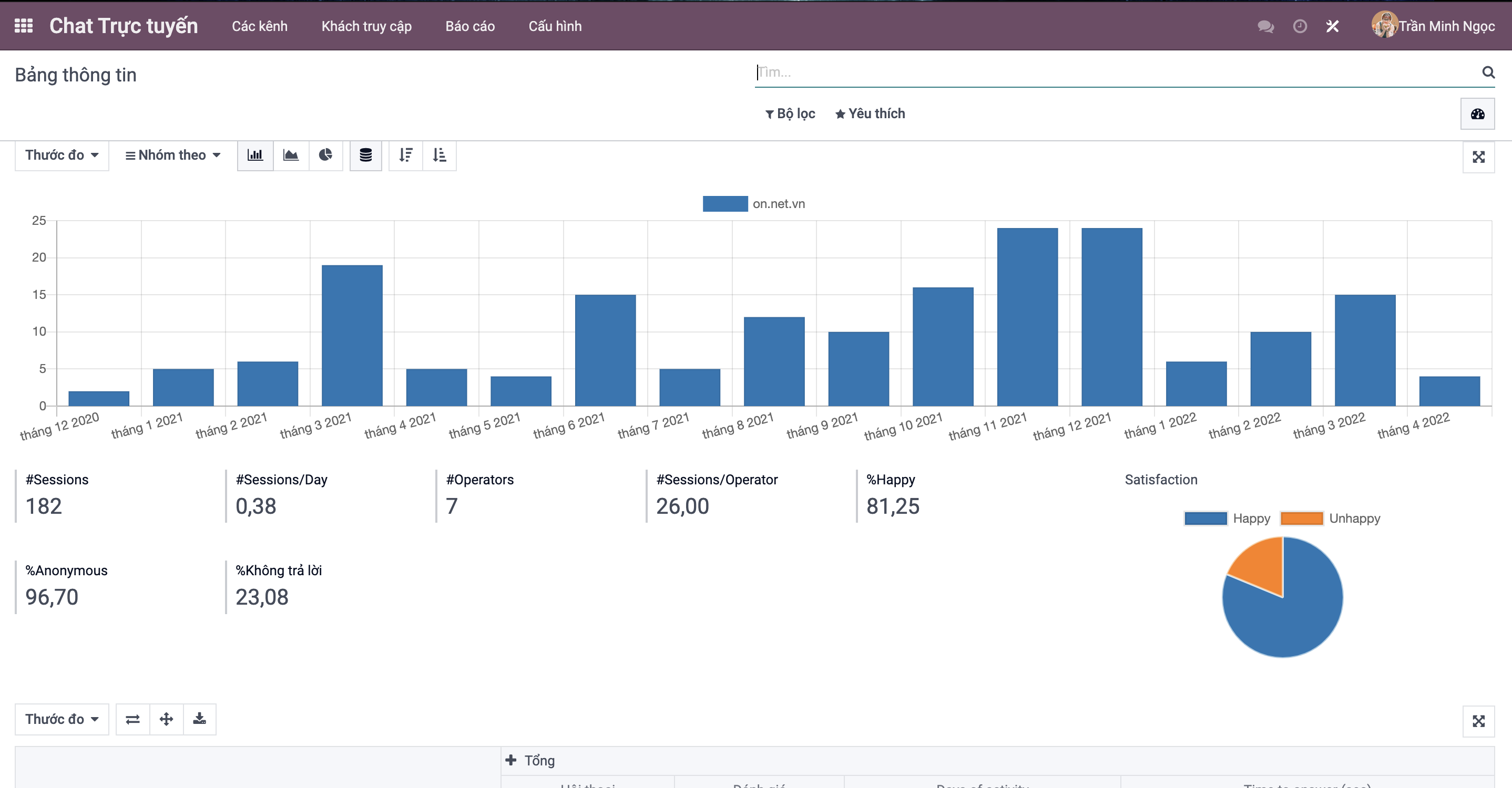 Tab Bảng điều khiển của Báo cáo hiển thị mức độ hài lòng của khách hàng đánh giá trên trang web của bạn. Bạn có thể kiểm tra số lượng phiên, tỷ lệ phần trăm khách hàng hài lòng và ẩn danh...