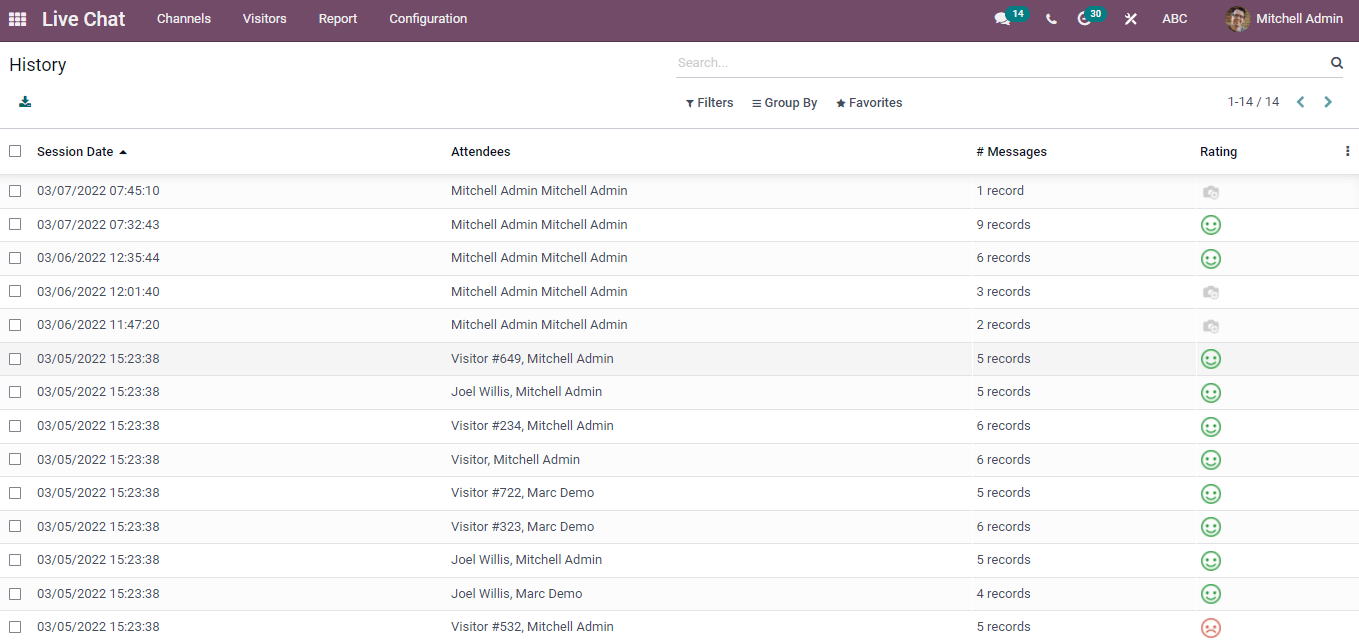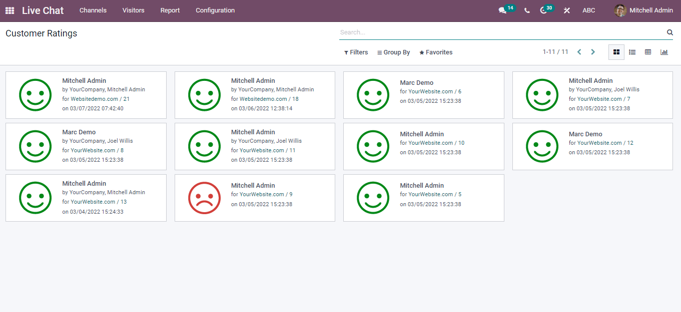Khách truy cập có thể đánh giá trang web dựa trên phản hồi của bạn. Bạn có thể truy cập Đánh giá của khách hàng bằng bảng điều khiển Trò chuyện trực tiếp của Odoo 15. Trong trang Đánh giá của khách hàng, chúng ta có thể biết về thông tin liên quan đến khách hàng, ngày, giờ đã gửi, nhà điều hành xếp hạng và xếp hạng được mô tả trong ảnh chụp màn hình bên dưới.