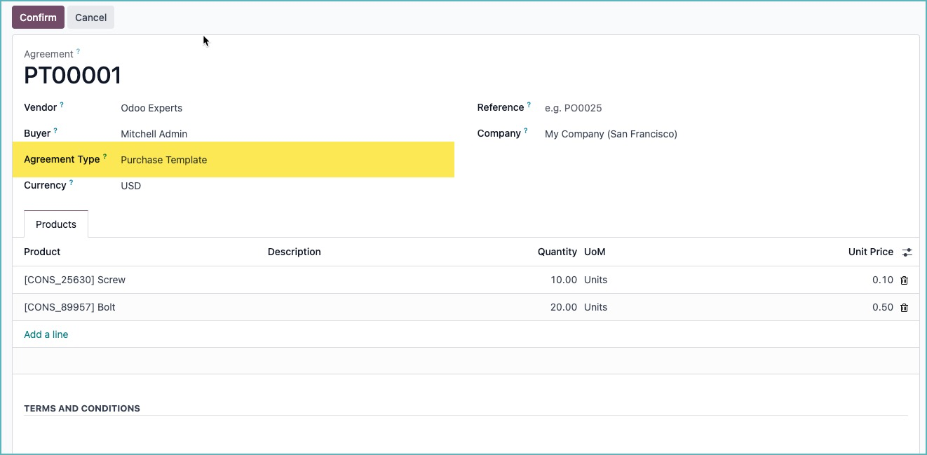 Odoo đã thêm một loại hợp đồng mua hàng mới để tạo yêu cầu báo giá một cách dễ dàng với số lượng cố định.