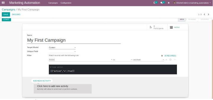 Bằng cách nhấp vào biểu tượng, ứng dụng Odoo Marketing Automation sẽ dẫn đến một trang hiển thị các chiến dịch đã tạo, trạng thái của nó, các tùy chọn để tạo và cấu hình các chiến dịch mới.