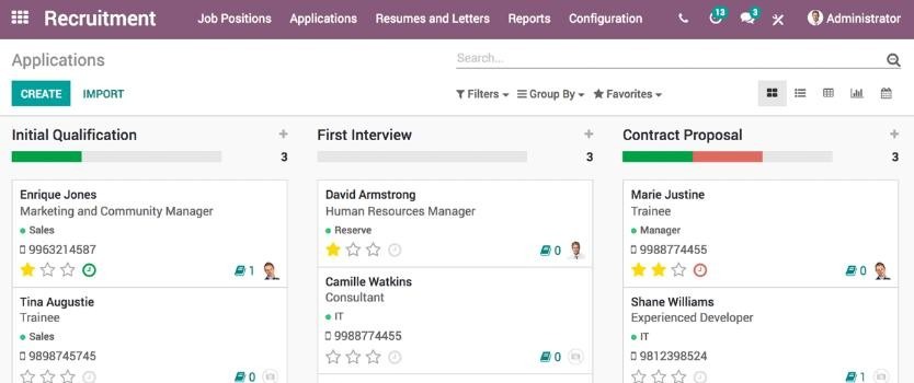 Phần mềm Odoo cung cấp tính năng quản lý thông tin nhân viên doanh nghiệp, lịch sử làm việc, năng lực và kỹ năng, cũng như quản lý quá trình tuyển dụng và đào tạo nhân viên.