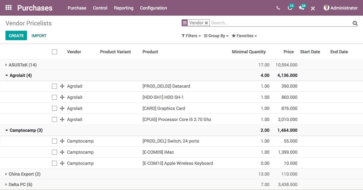 Module mua hàng Odoo ERP cung cấp tính năng quản lý hoạt động mua hàng doanh nghiệp, bao gồm: tạo yêu cầu mua hàng, đấu thầu, đặt hàng, thanh toán và kiểm soát tổng thể hoạt động mua hàng.