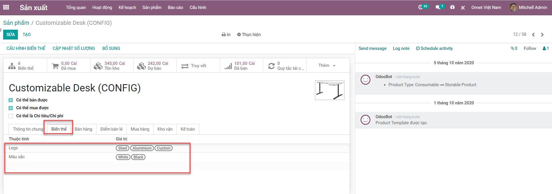 Biến thể sản phẩm bao gồm các chi tiết bao gồm màu sắc và kích thước của sản phẩm. Điều đó có nghĩa là một sản phẩm có thể có một hoặc nhiều biến thể sản phẩm. Ví dụ, hãy để chúng tôi lấy ví dụ cái bàn. Tại đây, công ty sản xuất bàn. Nhưng cùng một sản phẩm có thể có nhiều biến thể như bàn với nhiều màu sắc và loại chân bàn. Vì vậy, người dùng có thể tạo các biến thể sản phẩm bằng cách thêm các thuộc tính như màu sắc. Ví dụ công ty sản xuất áo bàn có màu trắng, đen. Bàn cũng có thể có chân bằng thép, nhôm hoặc theo yêu cầu của khách hàng. Điều đó có nghĩa là bàn có thể có các biến thể sản phẩm khác nhau như Bàn chân thép màuđen, bàn chân thép màu trắng, bàn chân nhôm màu đen, bàn chân nhôm màu trắng hoặc theo yêu cầu của khách.... . Có thể phân loại như vậy cho các sản phẩm khác nhau nếu bạn đang sử dụng ERP sản xuất của Odoo.
