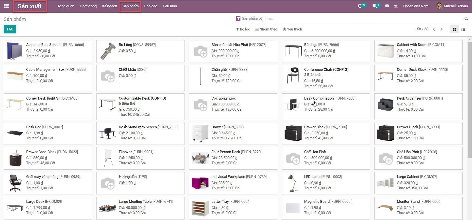 Odoo sản xuất hỗ trợ người dùng chuẩn bị danh sách sản phẩm với sự hỗ trợ của Giải pháp ERP. Ở đây, chúng ta có thể lấy ví dụ về một đơn vị sản xuất đồ gỗ. Sau đó, người dùng có thể phân loại các sản phẩm như ghế, bàn, kệ treo tường, kệ nhỏ, v.v.