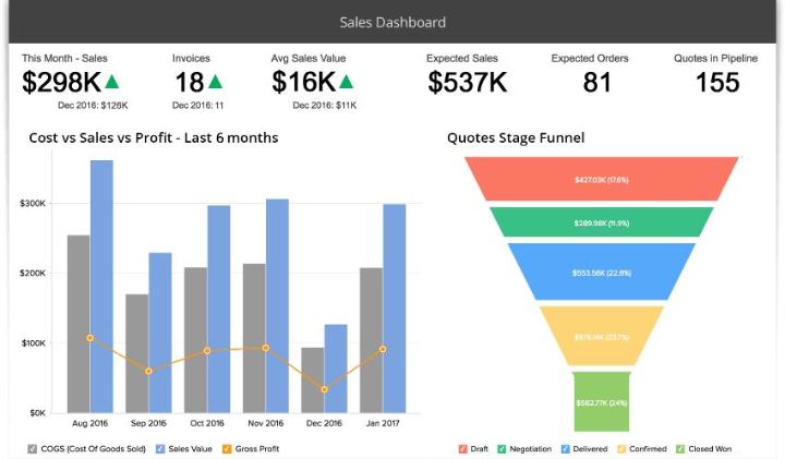 Trong tab Trang tổng quan trong Zoho, bạn có thể truy cập các công cụ phân tích tương tự. Ví dụ: công cụ Theo dõi cơ hội cung cấp cho bạn cái nhìn toàn diện về tất cả các hoạt động bán hàng, bao gồm quy mô giao dịch, nguồn khách hàng tiềm năng, thông tin về đối thủ cạnh tranh và bất kỳ số liệu nào khác mà bạn chọn (sử dụng menu thả xuống). Tất cả các báo cáo trong các mô-đun Bán hàng, Tiếp thị, Hỗ trợ và Kho hàng đều có thể tùy chỉnh hoàn toàn, ngoài 40+ báo cáo tiêu chuẩn có sẵn chỉ với một cú nhấp chuột.