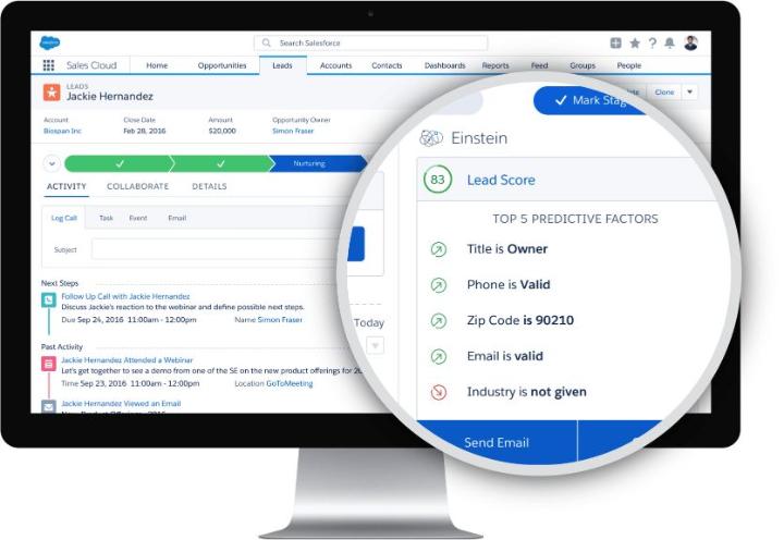 Cơ sở dữ liệu Salesforce lưu trữ dữ liệu khách hàng, lịch sử giao tiếp, các hoạt động liên quan và hơn thế nữa cho mọi liên hệ. Bạn cũng có thể sử dụng Einstein AI (trợ lý CRM ảo của Salesforce) để có thông tin chi tiết, chẳng hạn như tính điểm khách hàng tiềm năng dự đoán. Nếu bạn đã nhập khách hàng tiềm năng từ các chiến dịch tiếp thị, bạn có thể theo dõi hoạt động của họ trong thời gian thực và di chuyển chúng liên tục vào quy trình bán hàng của bạn.