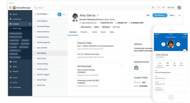 Các tính năng quản lý liên hệ của Zoho cũng sẽ không làm bạn thất vọng. Bạn có thể ghi lại số điện thoại, email, ghi chú cuộc họp, danh sách việc cần làm, tài liệu và hơn thế nữa mà không cần rời khỏi hệ thống, đặc biệt là vì Zoho tích hợp với hầu hết các ứng dụng văn phòng lớn.