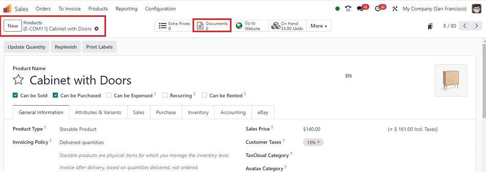 Giờ đây, người dùng Odoo có thể tạo và thêm tài liệu sản phẩm trong Mô-đun bán hàng mà khách hàng có thể tải xuống, in và chia sẻ khi đặt hàng. Điều này có thể được truy cập từ nút thông minh “Tài liệu” có sẵn bên trong bất kỳ biểu mẫu cấu hình sản phẩm nào như minh họa bên dưới.