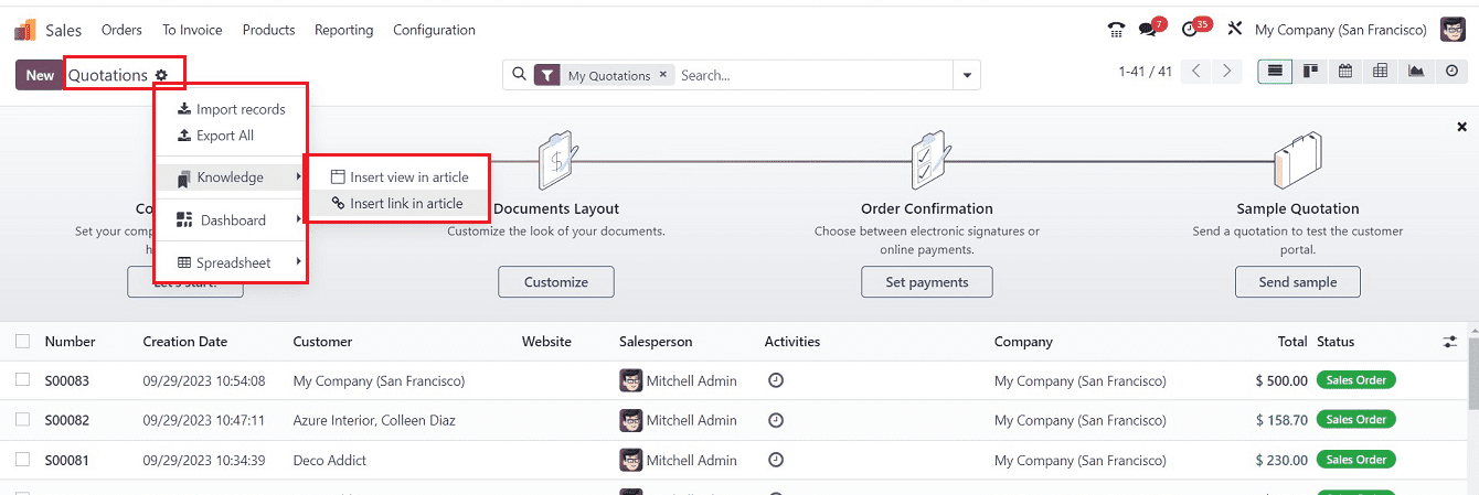 Nếu như trước đây "Action Menu" chỉ xuất hiện trong biểu mẫu cấu hình của mỗi ứng dụng, nhưng trong phiên bản Odoo 17 nó đã được thêm vào trang chủ của mỗi menu để thực hiện các nhiệm vụ cụ thể như nhập bản ghi, xuất dữ liệu, bảng điều khiển, bảng tính, và chỉnh sửa bài viết bằng Mô-đun Kiến thức và nhiều tính năng khác.