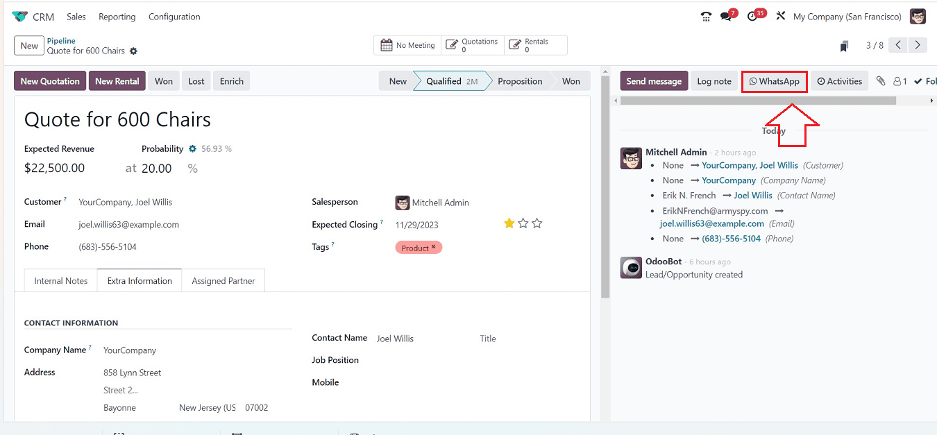 Odoo luôn chú trọng vào việc nâng cao trải nghiệm người dùng của mình hơn qua từng phiên bản, ngoài việc sử dụng giao tiếp qua tin nhắn SMS và Email thông thường thì nay trong Odoo 17 đã tích hợp thêm giao tiếp qua WhatsApp vào chatter.