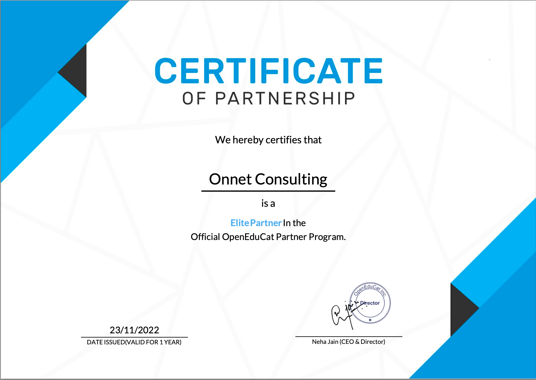 Ngày 23/11/2022, bà Neha Jain, CEO & Director của OpenEduCat đã trao chứng nhận Elite Partner cho Onnet Consulting. Điều này chính thức công nhận Onnet Consulting là một trong hai Elite Partner của OpenEduCat trên toàn thế giới.