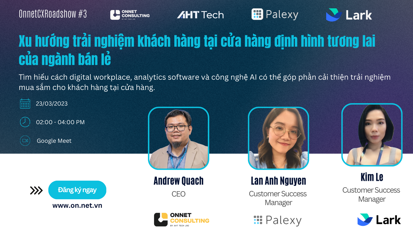 Đó là lý do tại sao Onnet Consulting, Palexy và Lark phối hợp cùng nhau thực hiện webinar "Xu hướng trải nghiệm khách hàng tại cửa hàng định hình tương lai của ngành bán lẻ", sự kiện nằm trong chuỗi  #OnnetCXRoadshow